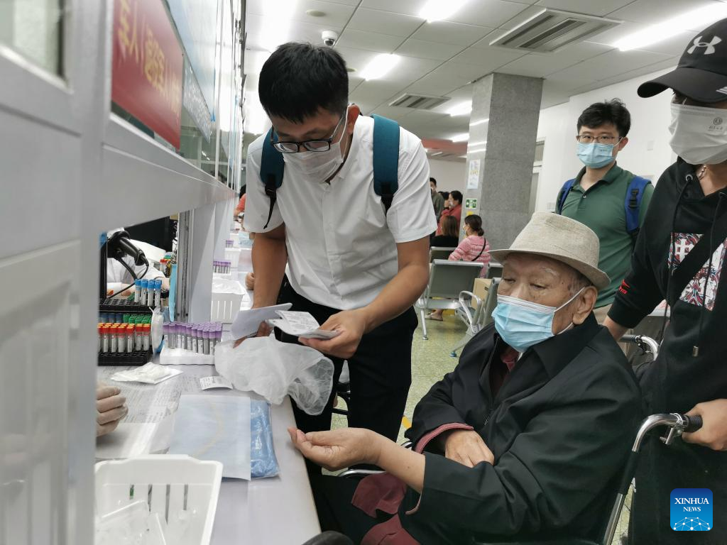 Chang Hao (1st L), a care manager or "nursing housekeeper", accompanies 92-year-old Mu Kunlai to a pre-surgery checkup at the hospital in preparation for eye surgery in Beijing, capital of China, Sept. 28, 2022.(Xinhua/Tai Sicong)