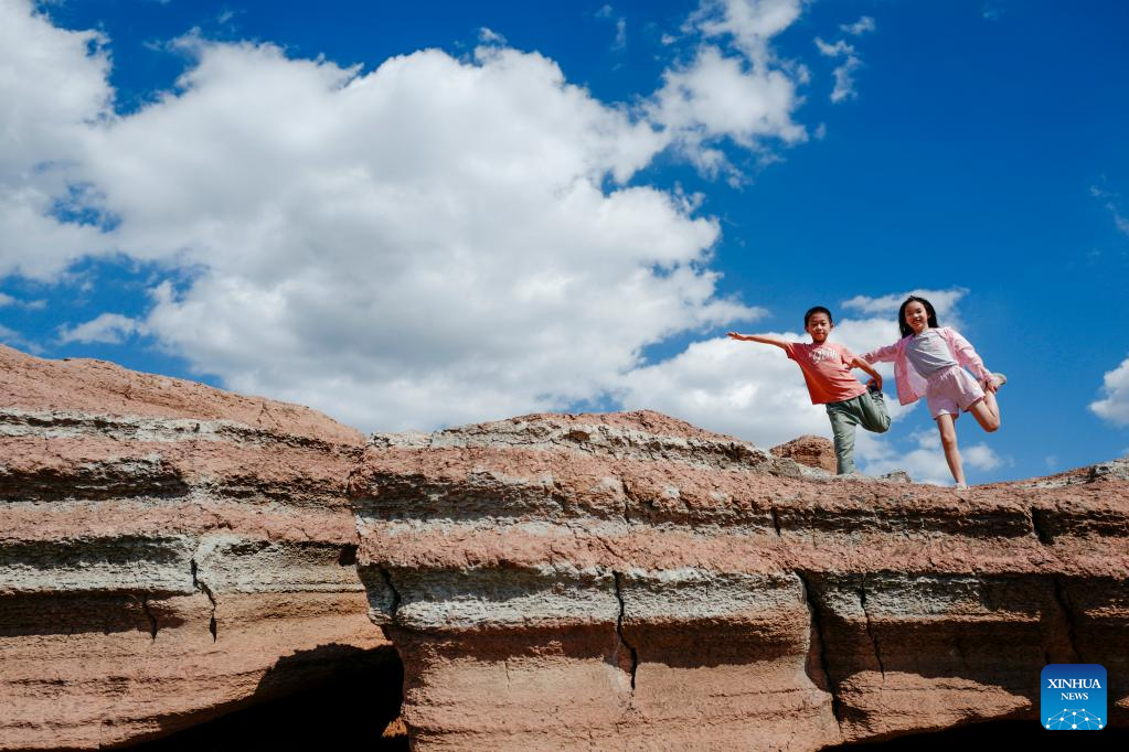 Children pose for pictures at a red stone forest geopark in Youyang Tujia and Miao Autonomous County, southwest China's Chongqing Municipality, Oct. 3, 2022. The Youyang red stone forest geopark, which has the karst landform, opened to the public during the National Day holiday. (Xinhua/Liu Chan)