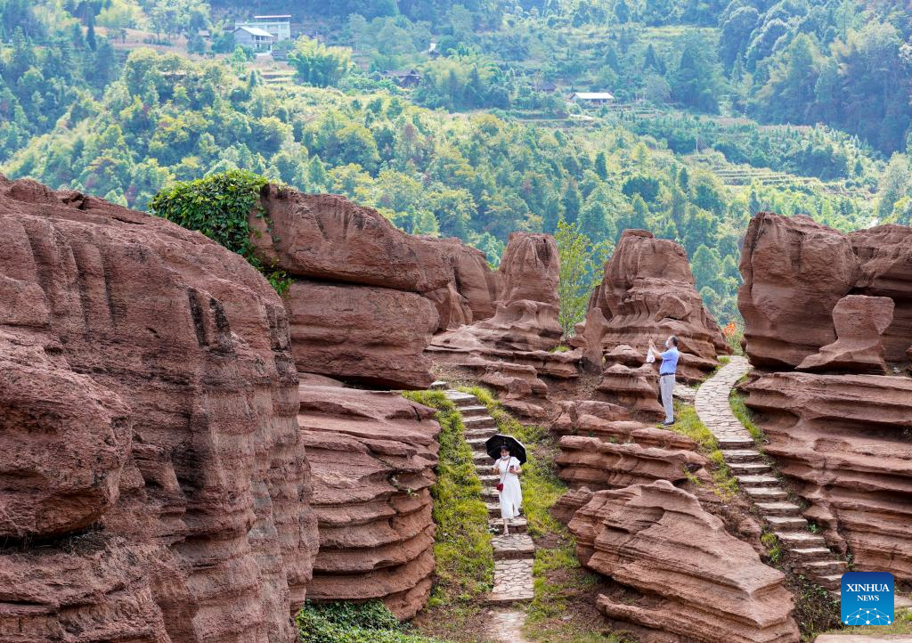 Tourists visit a red stone forest geopark in Youyang Tujia and Miao Autonomous County, southwest China's Chongqing Municipality, Oct. 3, 2022. The Youyang red stone forest geopark, which has the karst landform, opened to the public during the National Day holiday. (Xinhua/Liu Chan)
