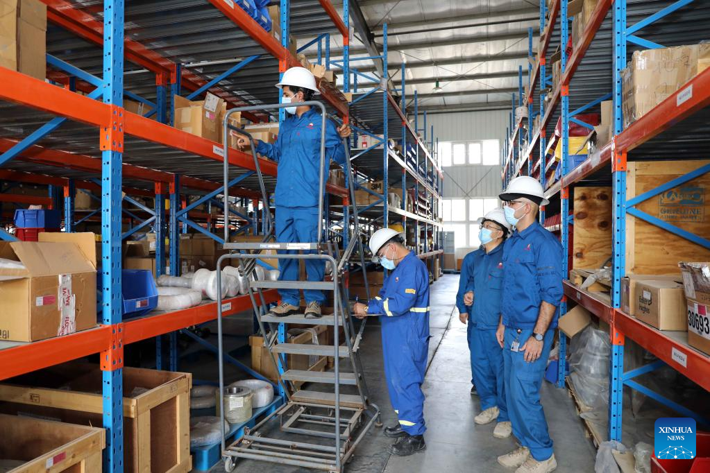 Employees of PetroChina work at a depot of the Halfaya oil field in Maysan province, Iraq, on Sept. 24, 2022. (Xinhua/Khalil Dawood)