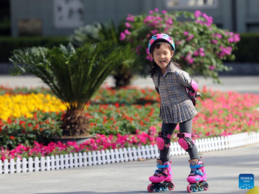 A girl enjoys roller skating at Donghuan park in Shijiazhuang, capital of north China's Hebei Province, Oct. 4, 2022. (Xinhua/Luo Xuefeng)