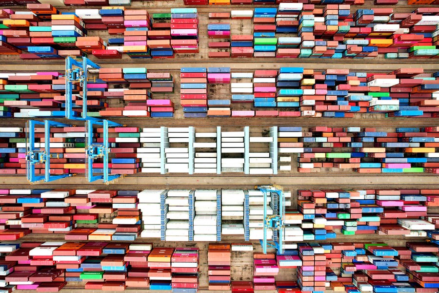 Aerial photo taken on June 9, 2022 shows a container terminal in Qingdao Port, east China's Shandong Province. (Photo by Yu Fangping/Xinhua)