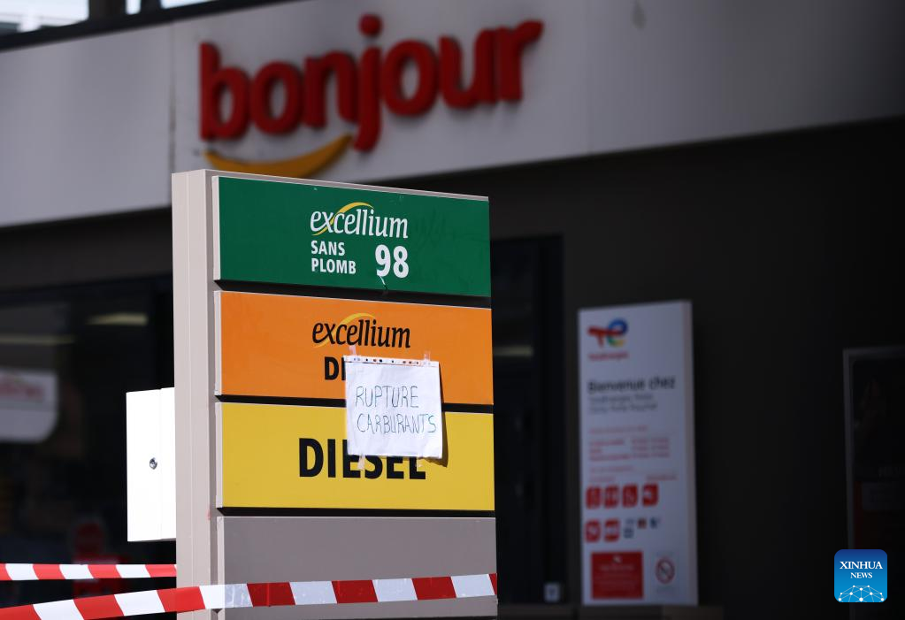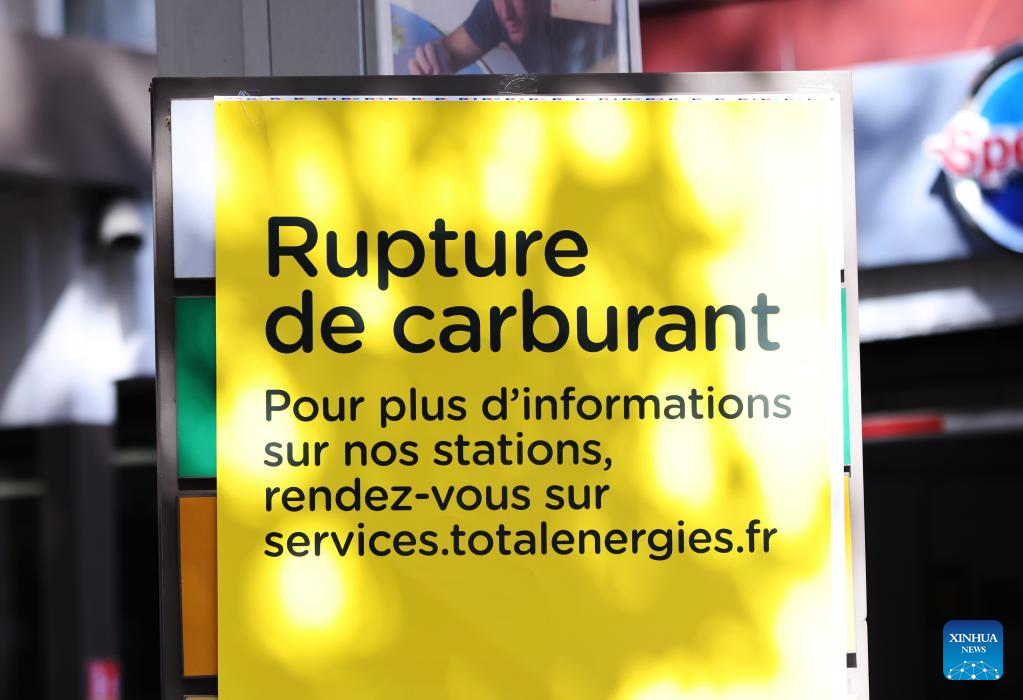 A poster reads stock-out is seen in front of a Total Energies gas station in Paris, France, Oct. 6, 2022. (Xinhua/Gao Jing)