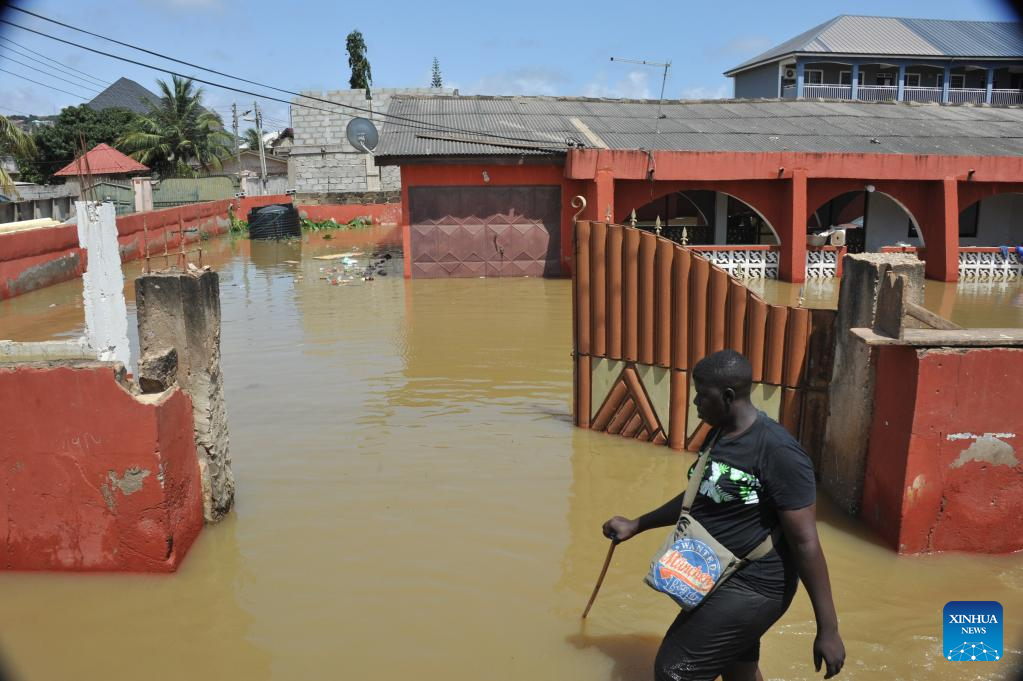 A person walks past a flooded house in Accra, Ghana, on Oct. 5, 2022. Thousands of residents of the southwestern part of Accra, the Ghanaian capital, have been displaced due to the spillage of the Weija Dam. The spillage of the dam was caused by excess water following torrential rains over the weekend, which contributed to the water level behind the dam rising above the maximum level. The dam built on the Densu River is the source of potable water for more than half of the 5.4 million population of the national capital. (Photo by Seth/Xinhua)