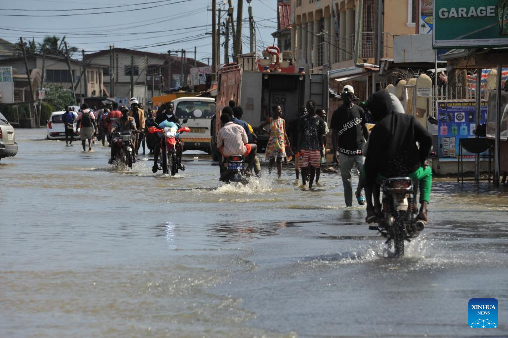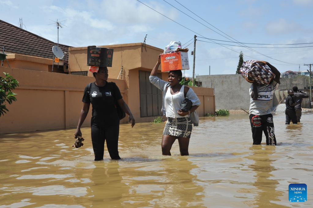 People wade through a flooded street in Accra, Ghana, on Oct. 5, 2022. Thousands of residents of the southwestern part of Accra, the Ghanaian capital, have been displaced due to the spillage of the Weija Dam. The spillage of the dam was caused by excess water following torrential rains over the weekend, which contributed to the water level behind the dam rising above the maximum level. The dam built on the Densu River is the source of potable water for more than half of the 5.4 million population of the national capital. (Photo by Seth/Xinhua)