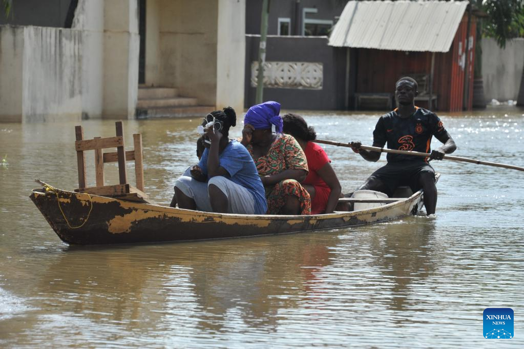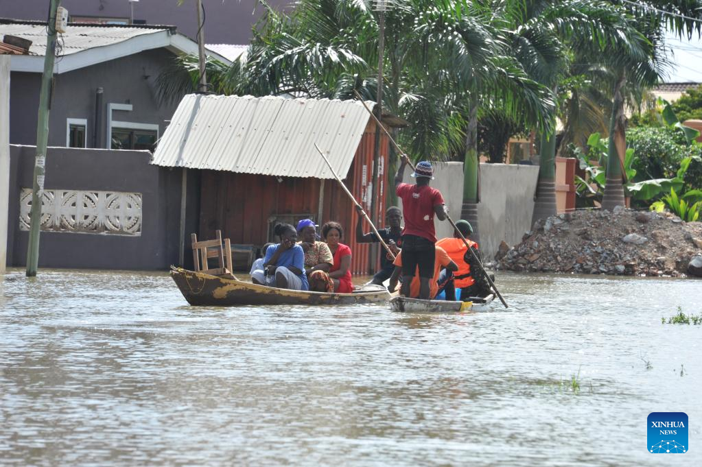 People travel in a canoe in a flooded area in Accra, Ghana, on Oct. 5, 2022. Thousands of residents of the southwestern part of Accra, the Ghanaian capital, have been displaced due to the spillage of the Weija Dam. The spillage of the dam was caused by excess water following torrential rains over the weekend, which contributed to the water level behind the dam rising above the maximum level. The dam built on the Densu River is the source of potable water for more than half of the 5.4 million population of the national capital. (Photo by Seth/Xinhua)