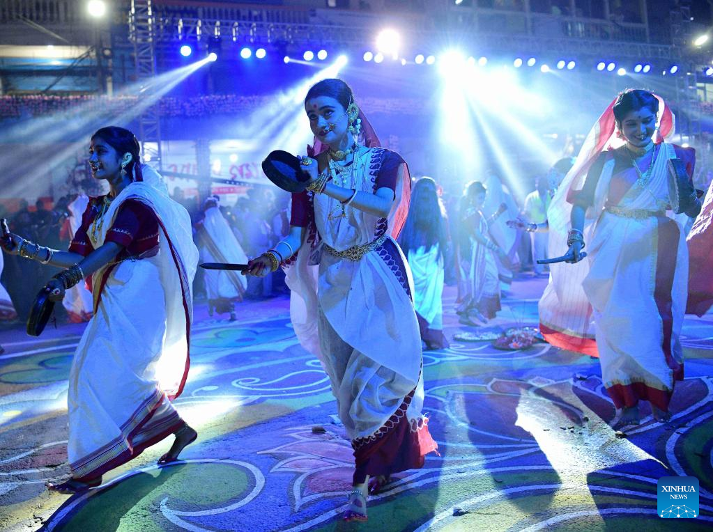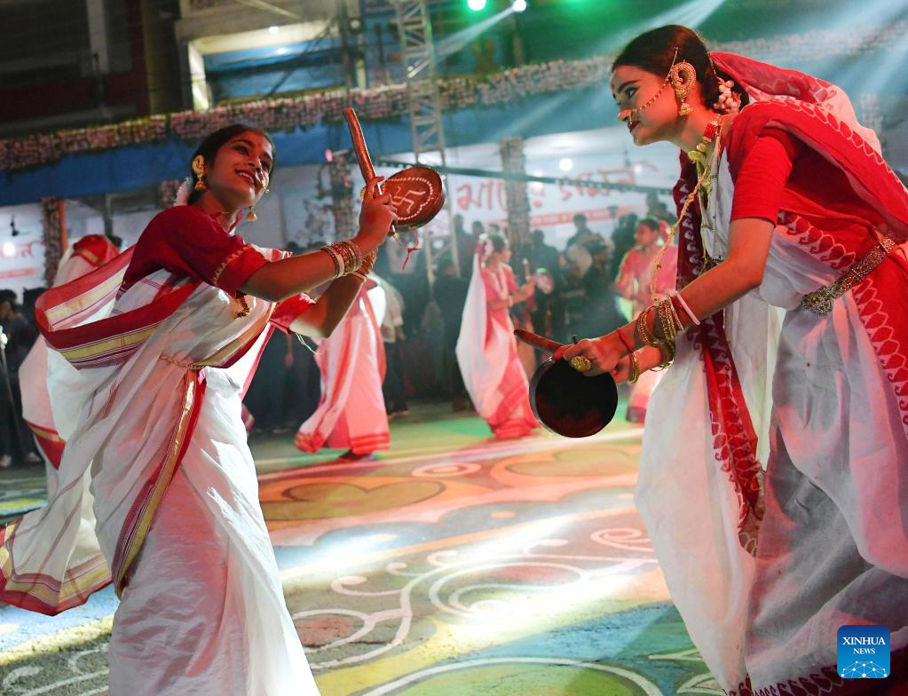 Dancers perform during Durga Puja carnival in Agartala, the capital city of Tripura, northeastern India, on Oct. 7, 2022. (Str/Xinhua)