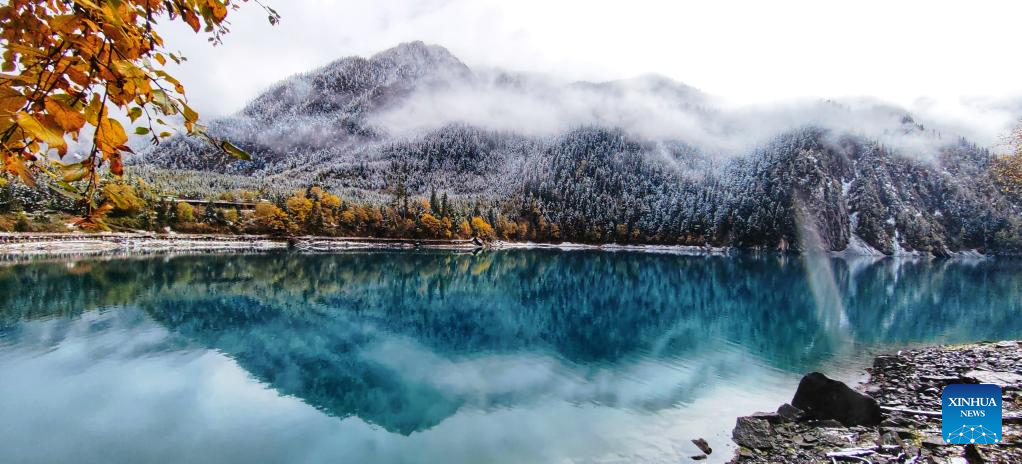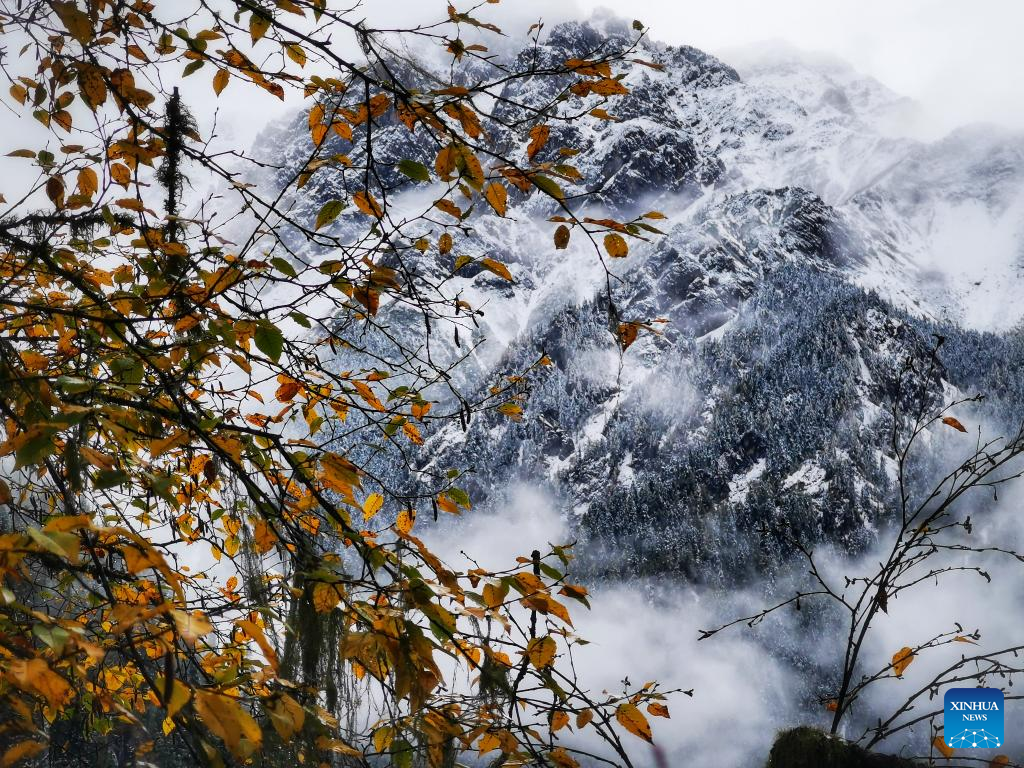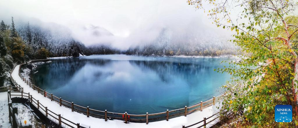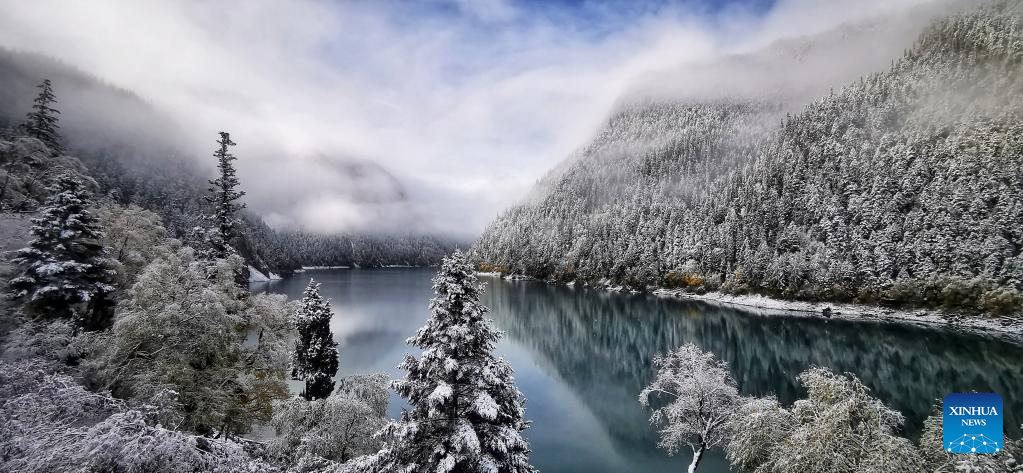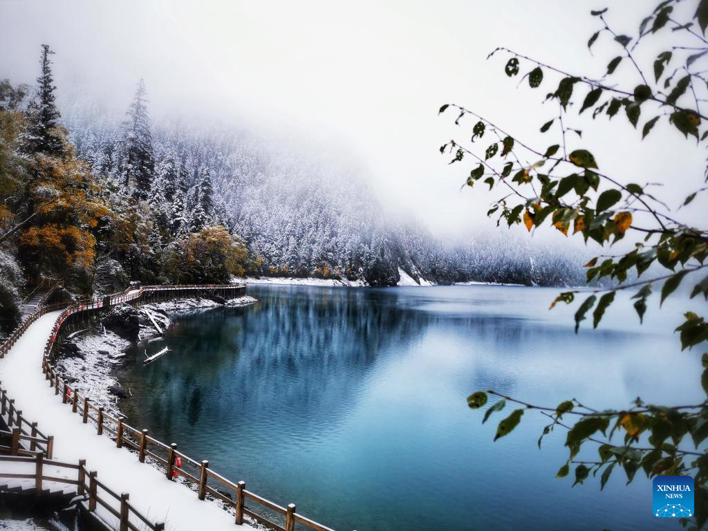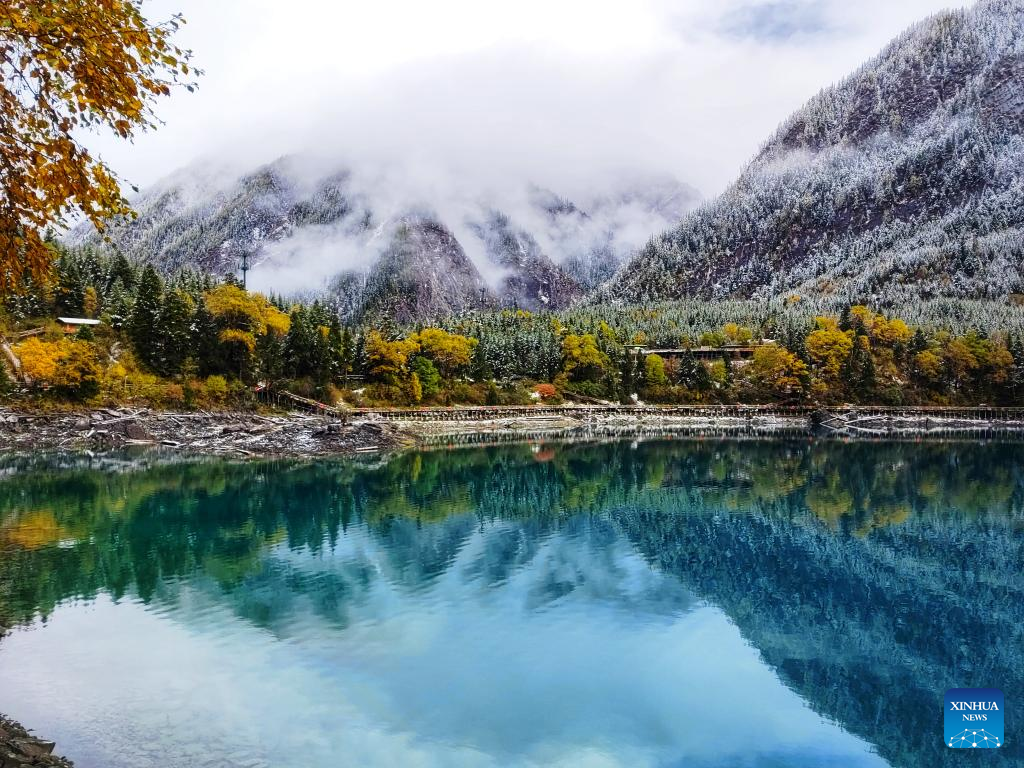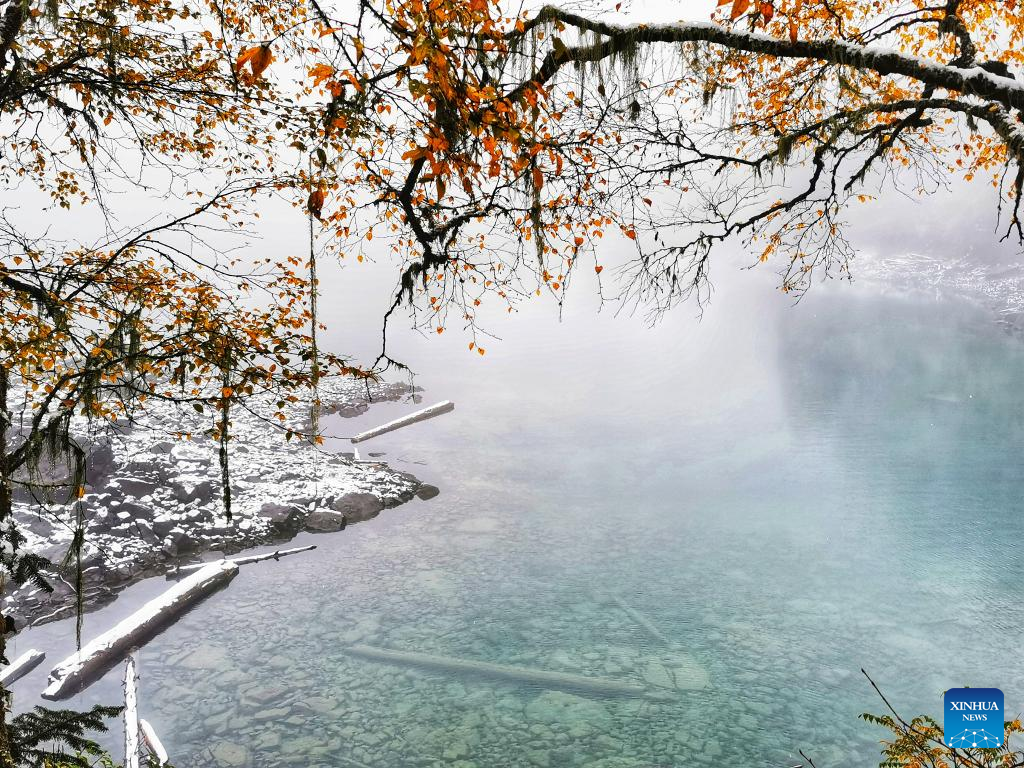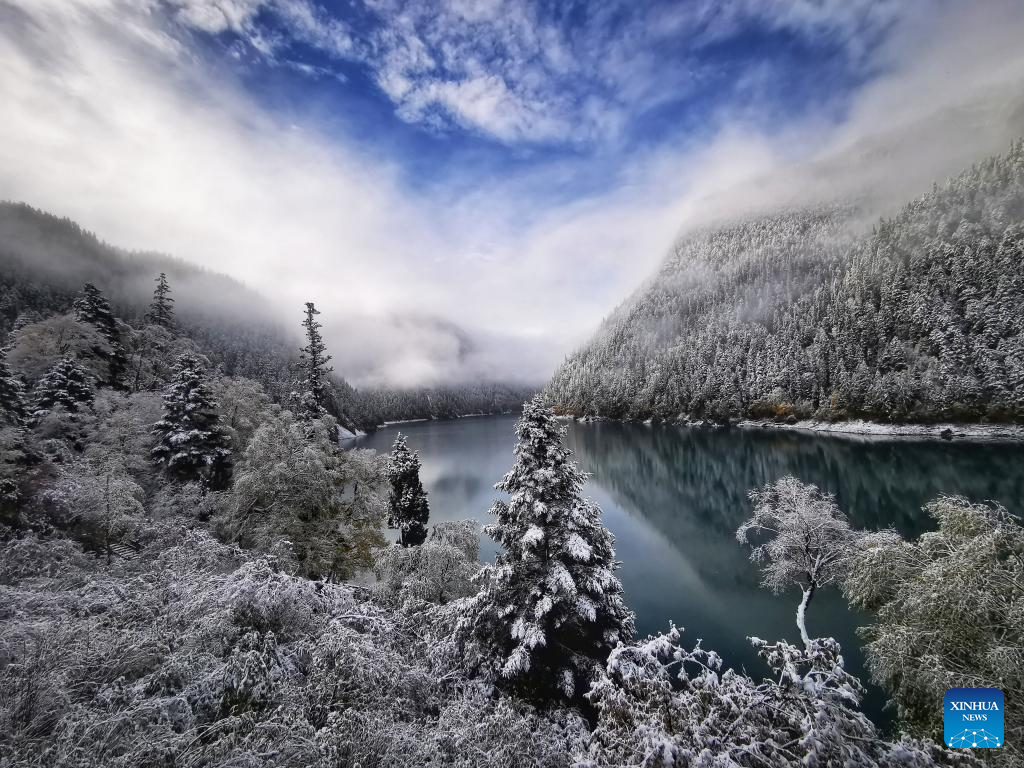 Photo taken on Oct. 7, 2022 shows a view of the Jiuzhaigou scenic area after snow in southwest China's Sichuan Province. (Photo by Liang Feng/Xinhua)
