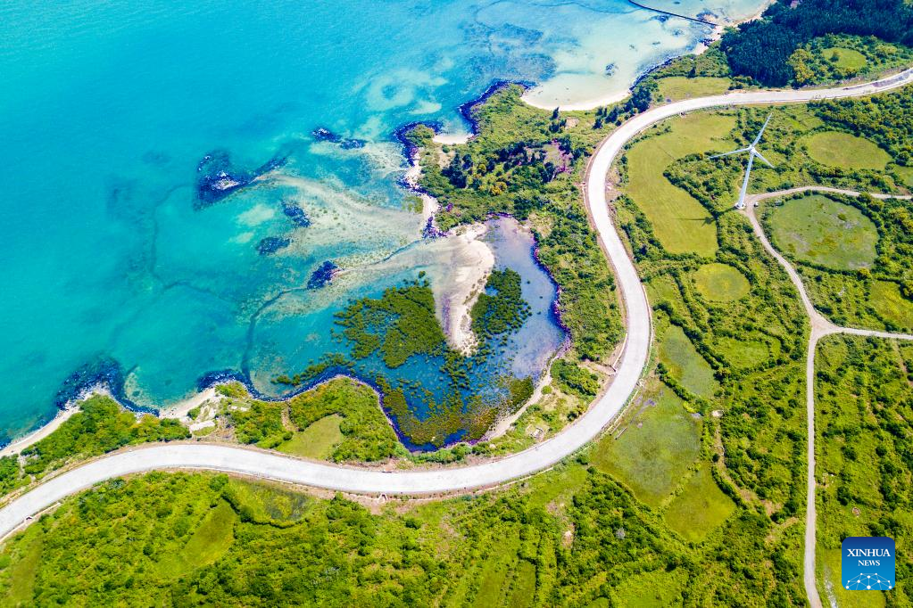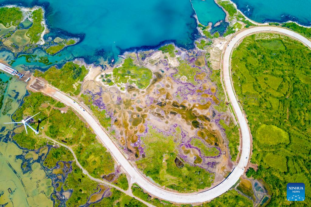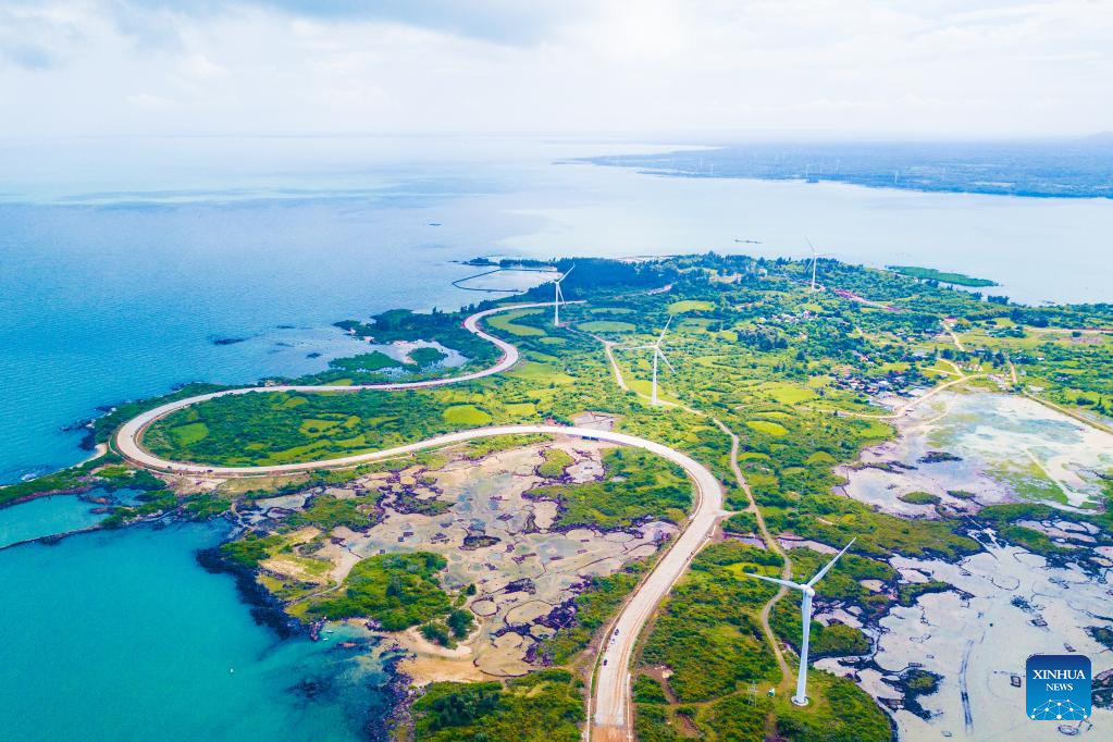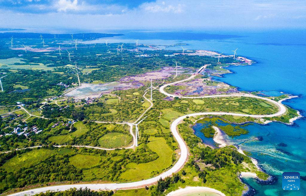 Aerial photo taken on Oct. 6, 2022 shows a view of a scenic coastal highway in Danzhou, south China's Hainan Province. The Danzhou section of the scenic coastal highway in Hainan is under construction at present. The main line of the highway will be 988.2 km long. The highway will stretch through 12 coastal cities and counties and the Yangpu Economic Development Zone, connecting bays, capes, tourist attractions and coastal resort areas throughout Hainan. (Xinhua/Pu Xiaoxu)