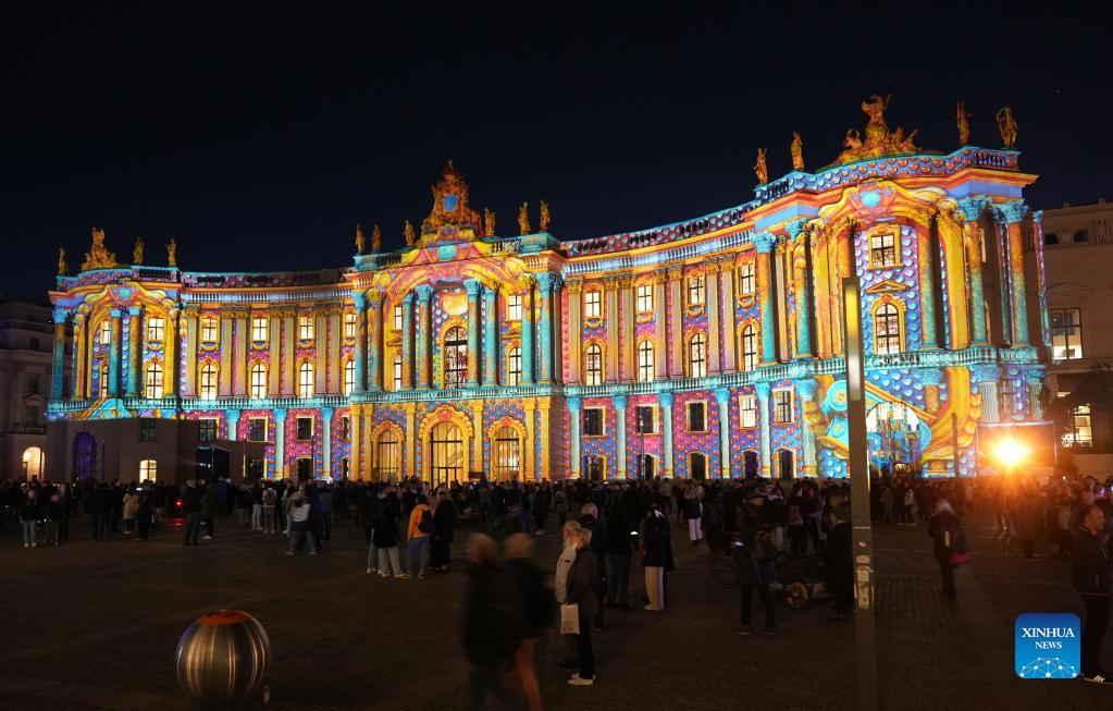 Photo taken on Oct. 7, 2022 shows the law faculty building of Humboldt University of Berlin illuminated during the 2022 Festival of Lights in Berlin, Germany. Berlin on Friday turned into a city of light art with the opening of the 2022 Festival of Lights, which will last until Oct. 16. (Photo by Stefan Zeitz/Xinhua)