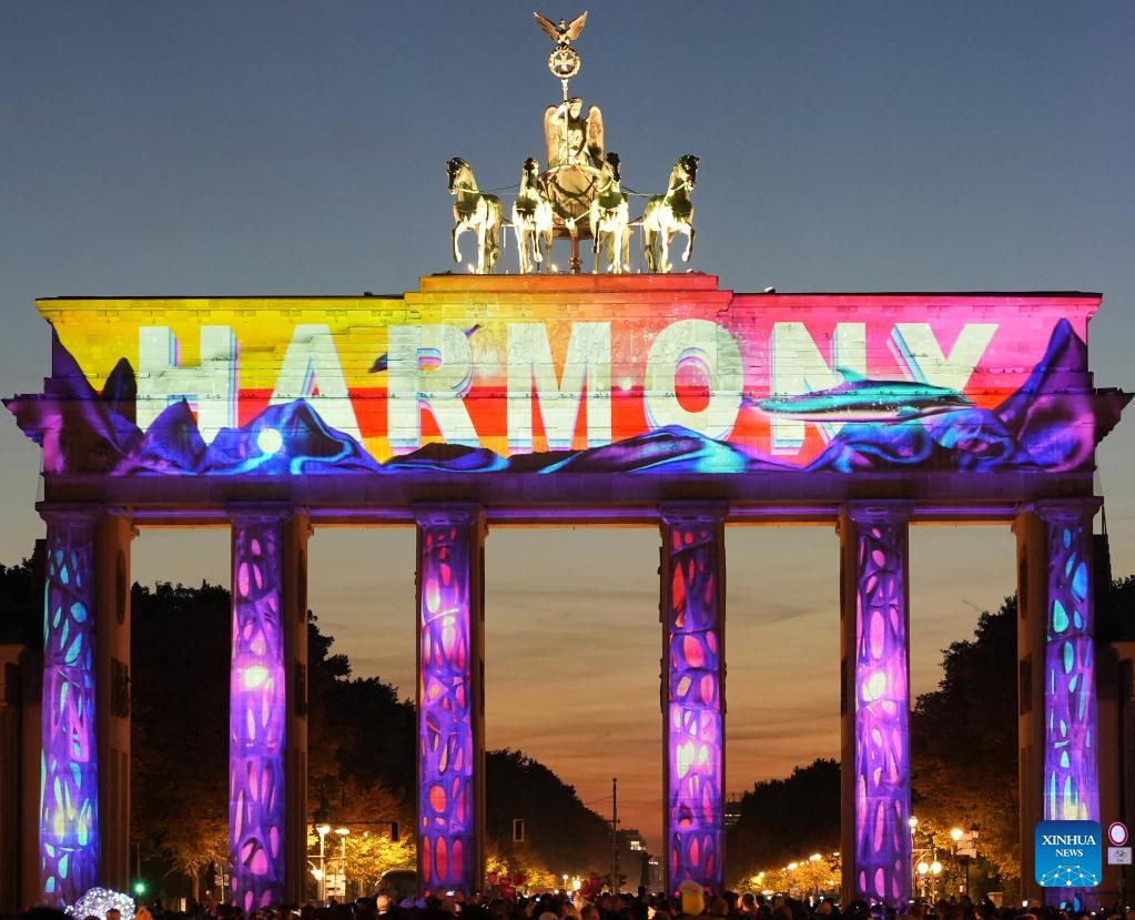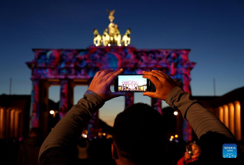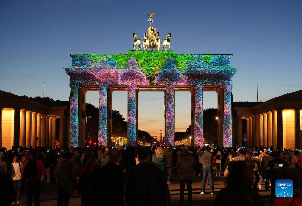 Photo taken on Oct. 7, 2022 shows the Brandenburg Gate illuminated during the 2022 Festival of Lights in Berlin, Germany. Berlin on Friday turned into a city of light art with the opening of the 2022 Festival of Lights, which will last until Oct. 16. (Photo by Stefan Zeitz/Xinhua)