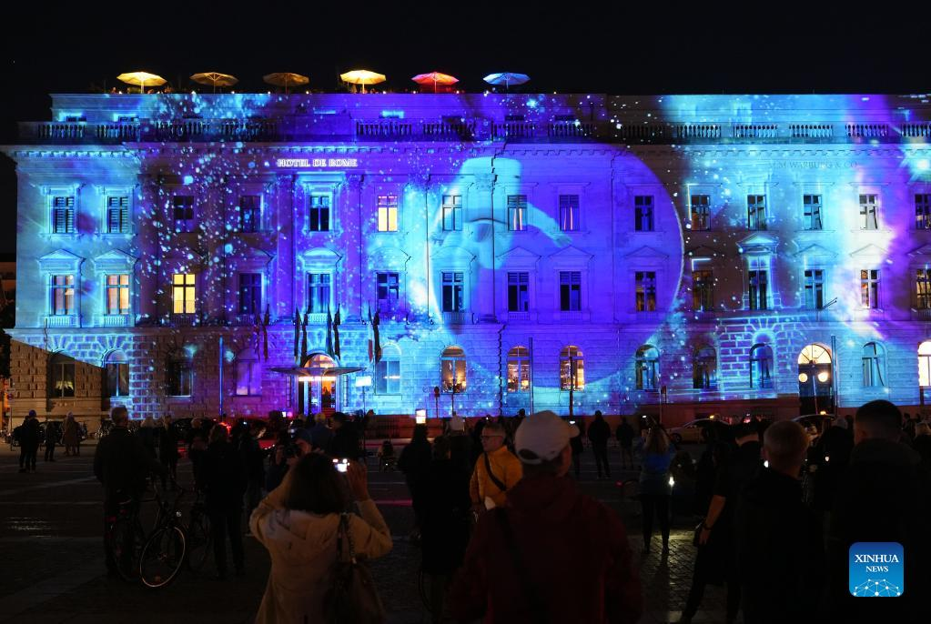 Photo taken on Oct. 7, 2022 shows the Hotel de Rome illuminated during the 2022 Festival of Lights in Berlin, Germany. Berlin on Friday turned into a city of light art with the opening of the 2022 Festival of Lights, which will last until Oct. 16. (Photo by Stefan Zeitz/Xinhua)