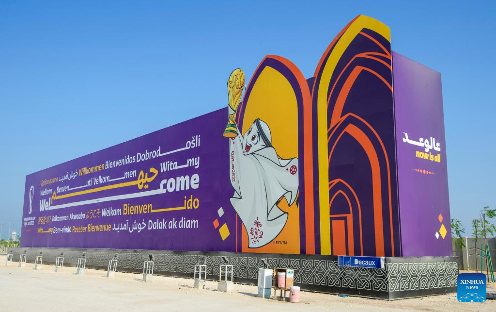 A large Qatar 2022 FIFA World Cup welcome billboard is displayed beside street in Doha, Qatar on Oct. 7, 2022. (Photo by Nikku/Xinhua)