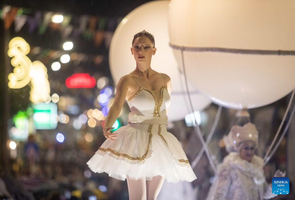 A participant performs ballet during the parade of Ayia Napa Medieval Festival in Ayia Napa, Cyprus, Oct. 8, 2022. (Photo by George Christophorou/Xinhua)