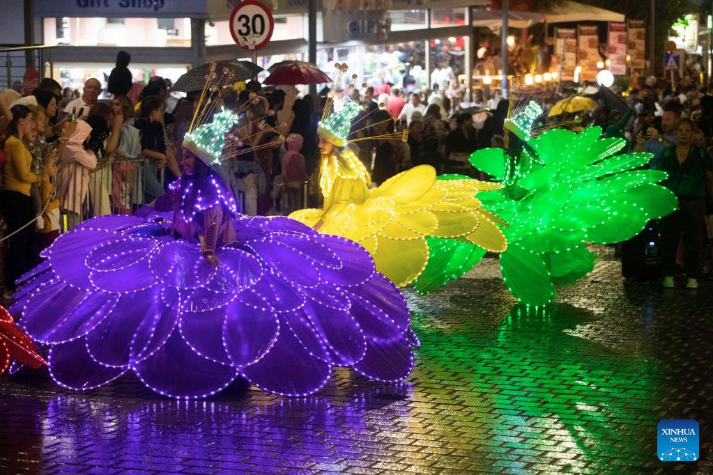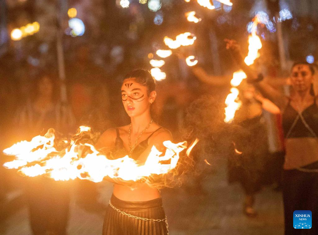 Participants play with fire sticks during the parade of Ayia Napa Medieval Festival in Ayia Napa, Cyprus, Oct. 8, 2022. (Photo by George Christophorou/Xinhua)