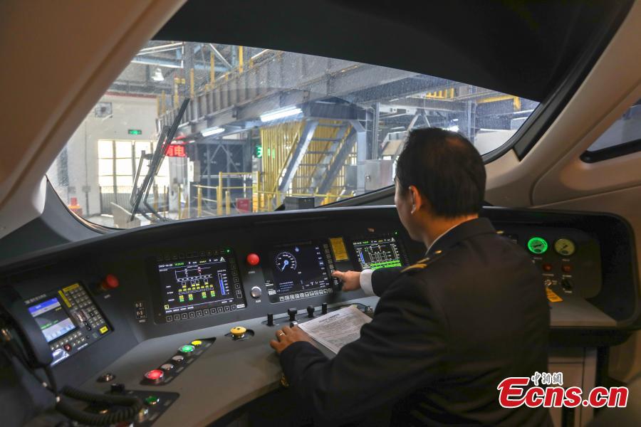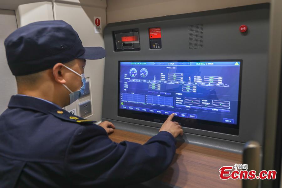 A driver checks signal signs on a new Fuxing bullet train at a maintenance station of Nanchang Railway in Nanchang, east China's Jiangxi Province, Oct. 8, 2022. (Photo: China News Service/Liu Lixin)
