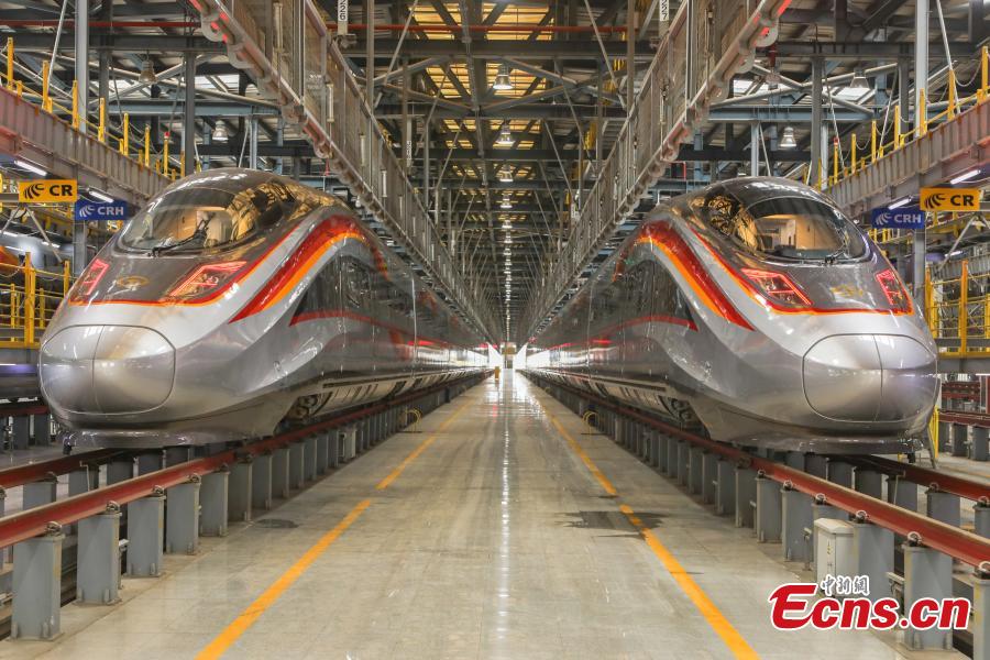 Fuxing bullet intelligent trains make debut at a maintenance station of Nanchang Railway in Nanchang, east China's Jiangxi Province, Oct. 8, 2022. The Fuxing bullet trains are expected to start operation soon. (Photo: China News Service/Liu Lixin)