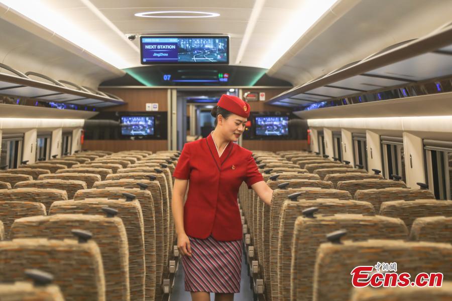 A crew member inspects a new Fuxing bullet train in Nanchang, east China's Jiangxi Province, Oct. 8, 2022. (Photo: China News Service/Liu Lixin)