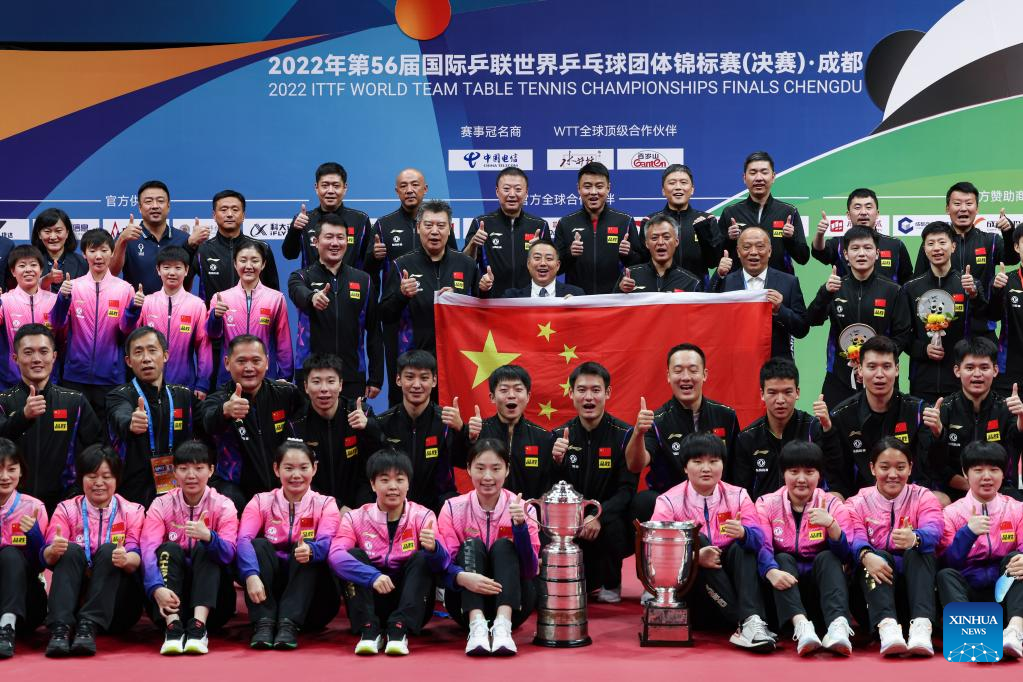 Members of team China and president of Chinese Table Tennis Association (CTTA) Liu Guoliang pose for photos during the awarding ceremony after the men's teams final match against Germany at the 2022 ITTF World Team Table Tennis Championships Finals in Chengdu, southwest China's Sichuan Province, Oct. 9, 2022. (Xinhua/Jiang Hongjing)