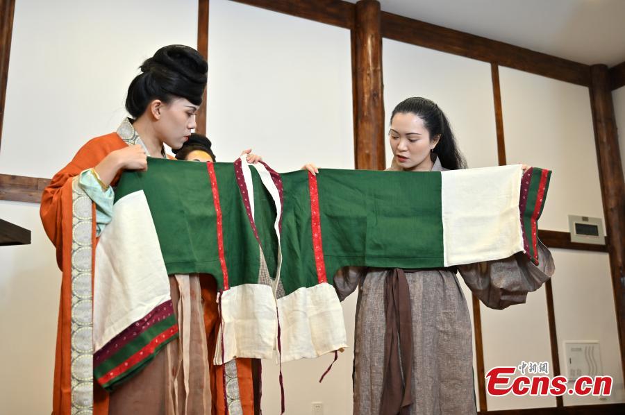 Team members display a hand-made traditional Chinese Hanfu costume in a studio in Nanning, south China's Guangxi Zhuang Autonomous Region, Oct. 9, 2022. (Photo: China News Service/Yu Jing)