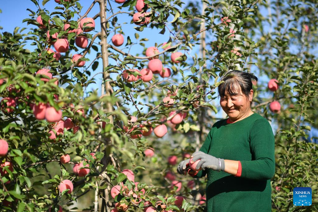 A farmer harvests apples at an orchard in Yongxiang Town of Luochuan County, northwest China's Shaanxi Province, Oct. 10, 2022. (Xinhua/Zhang Bowen)