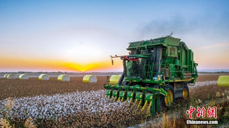 A cotton picker harvests cotton in a field in Karamay, northwest China's Xinjiang Uygur Autonomous Region. (Photo: China News Service/Min Yong)