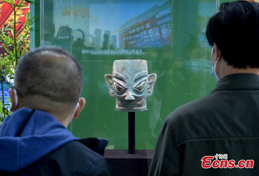 A bronze human head unearthed from the No. 8 sacrificial pit is on display during the themed exhibition "Forging Ahead in the New Era" in Beijing, Oct. 10, 2022. (Photo: China News Network/Li Peiyun)