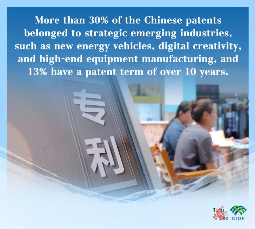 More than 30 percent of the Chinese patents belonged to strategic emerging industries, such as new energy vehicles, digital creativity, and high-end equipment manufacturing, and 13 percent have a patent term of over 10 years.