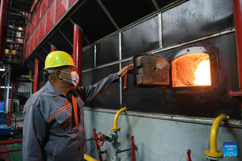 A worker checks the operation of a boiler at a heating company in Hohhot, north China's Inner Mongolia Autonomous Region, Oct. 10, 2022. Heating supply starts earlier this year as a response to deal with a sharp drop in temperature in Hohhot. (Xinhua/Bei He)