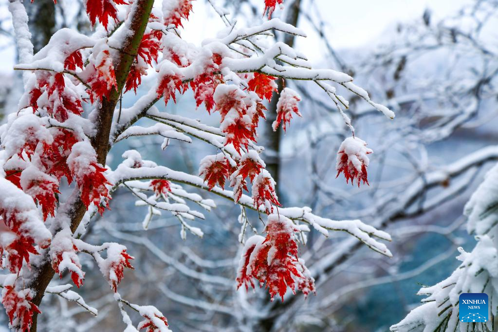 Photo taken on Oct. 10, 2022 shows a view of Tianqiaogou forest park after snow in Dandong, northeast China's Liaoning Province. (Photo by Zhang Xiaoqiang/Xinhua)
