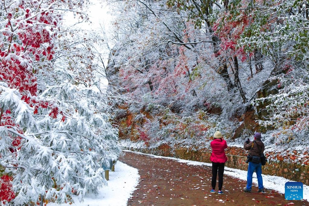 Tourists enjoy the view of Tianqiaogou forest park after snow in Dandong, northeast China's Liaoning Province, Oct. 10, 2022. (Photo by Zhang Xiaoqiang/Xinhua)