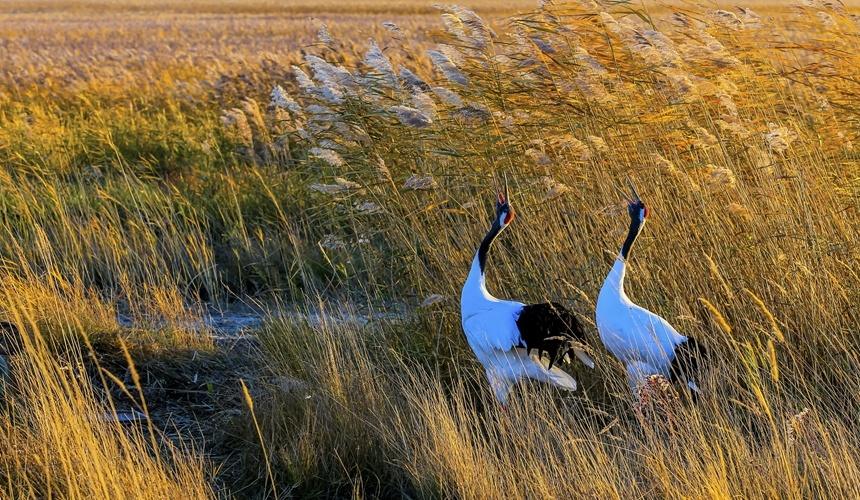 Photo shows two red-crowned cranes at Zhalong National Nature Reserve in northeast China's Heilongjiang Province.