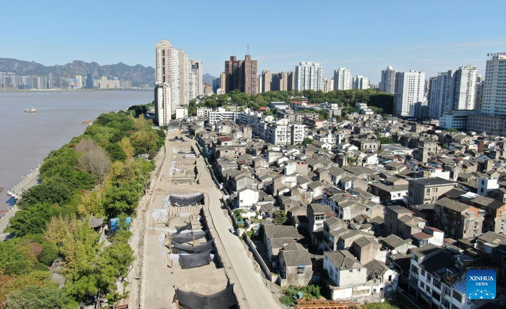 Aerial photo taken on Oct. 10, 2022 shows a view of the archaeological site of Shuomen ancient port along the Oujiang River in Wenzhou, east China's Zhejiang Province.