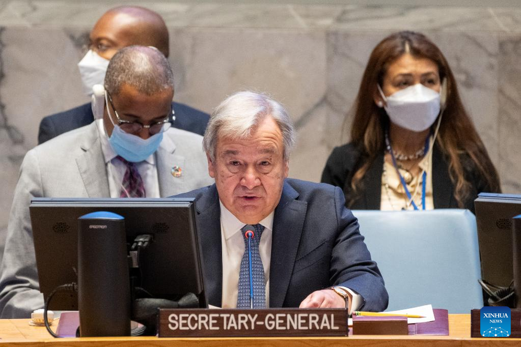 UN Secretary-General Antonio Guterres (L, Front) addresses a Security Council meeting on cooperation between the United Nations and regional and subregional organizations in maintaining international peace and security at the UN headquarters in New York, on Oct. 11, 2022. Lauding the collaboration between the United Nations and the African Union (AU) as the best ever, UN Secretary-General Antonio Guterres on Tuesday warned major challenges lie ahead. (Eskinder Debebe/UN Photo/Handout via Xinhua)