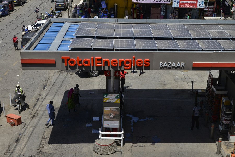 People go about their businesses at a gas station with the installation of solar panels on the roof in Nakuru County, Kenya, on Sept. 29, 2022. (Photo by Sheikh Maina/Xinhua)
