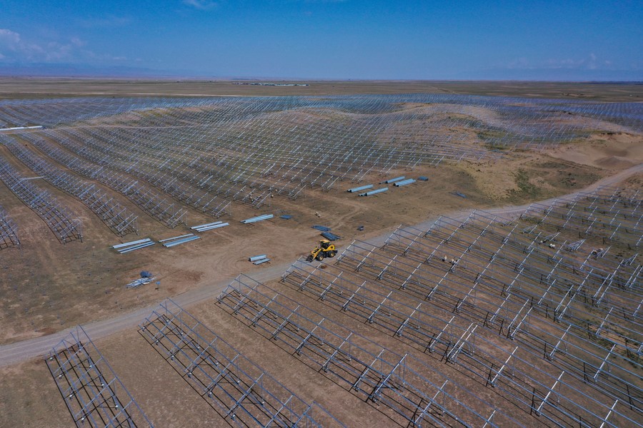 Aerial photo taken on June 8, 2022 shows the construction site of a one million kilowatts photovoltaic project in Gonghe County of Hainan Tibetan Autonomous Prefecture, northwest China's Qinghai Province. (Xinhua/Zhang Long)