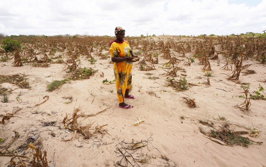 Villager Caroline is seen in a withered maize crops field in Kidemu sub-location in Kilifi County, Kenya, March 23, 2022. (Xinhua/Dong Jianghui)