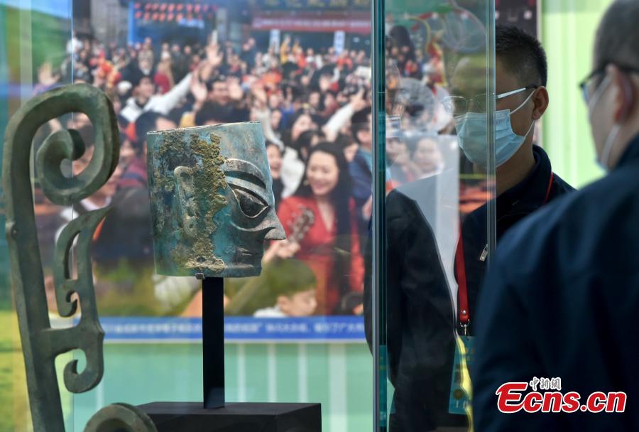 Visitors view cultural relics unearthed from the No. 8 sacrificial pit of Sanxingdui Ruins sit is on display during the themed exhibition "Forging Ahead in the New Era" in Beijing, Oct. 10, 2022. (Photo: China News Network/Li Peiyun)
