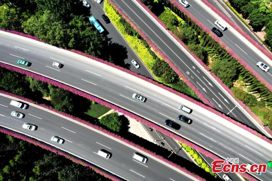 Cars run past blooming Bougainvillea on a viaduct in Fuzhou, east China's Fujian Province, Oct. 11, 2022. (Photo: China News Service/Wang Dongming)