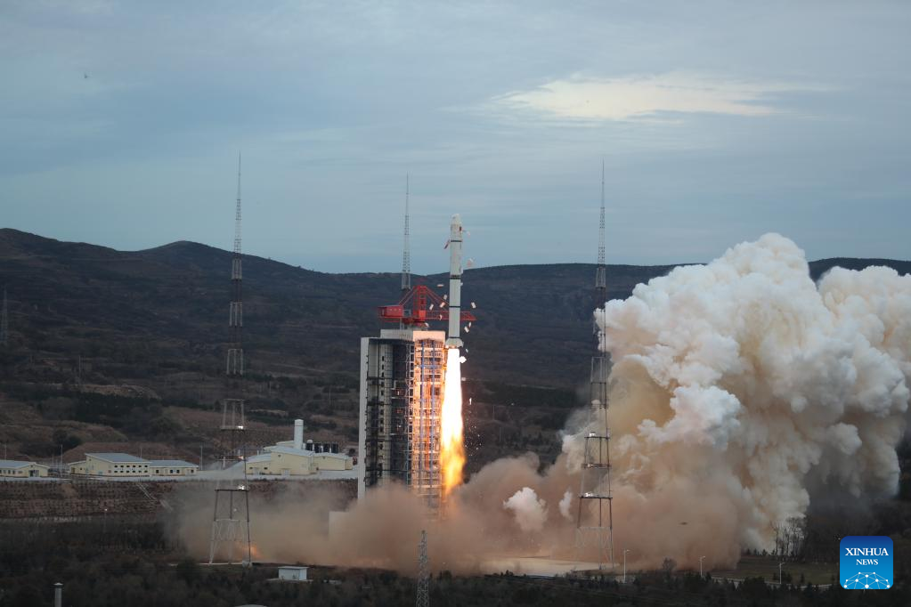 A Long March-2C rocket carrying the S-SAR01, a new satellite for disaster reduction, emergency management, and environment monitoring, blasts off from the Taiyuan Satellite Launch Center in north China's Shanxi Province Oct. 13, 2022. The rocket lifted off at 6:53 a.m. (2253 GMT Oct. 12) and sent the S-SAR01 satellite into the preset orbit. (Photo by Xu Chunlei/Xinhua)