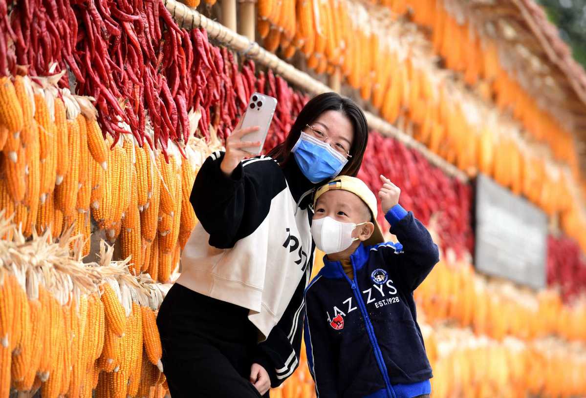 Tourists pose with crops in Duanzhuang village of Shijiazhuang, capital of North China's Hebei province, Oct 5, 2022. [Photo/Xinhua]