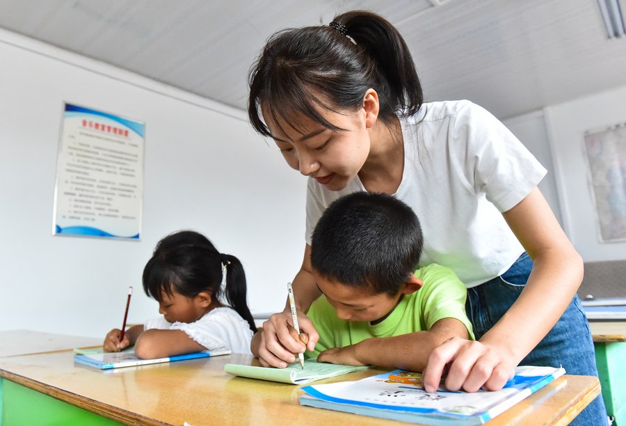 A teacher tutors her students writing characters at Mawuzhai boarding primary school in Jincheng city, North China's Shanxi province, Sept 9, 2020. [Photo/Xinhua]