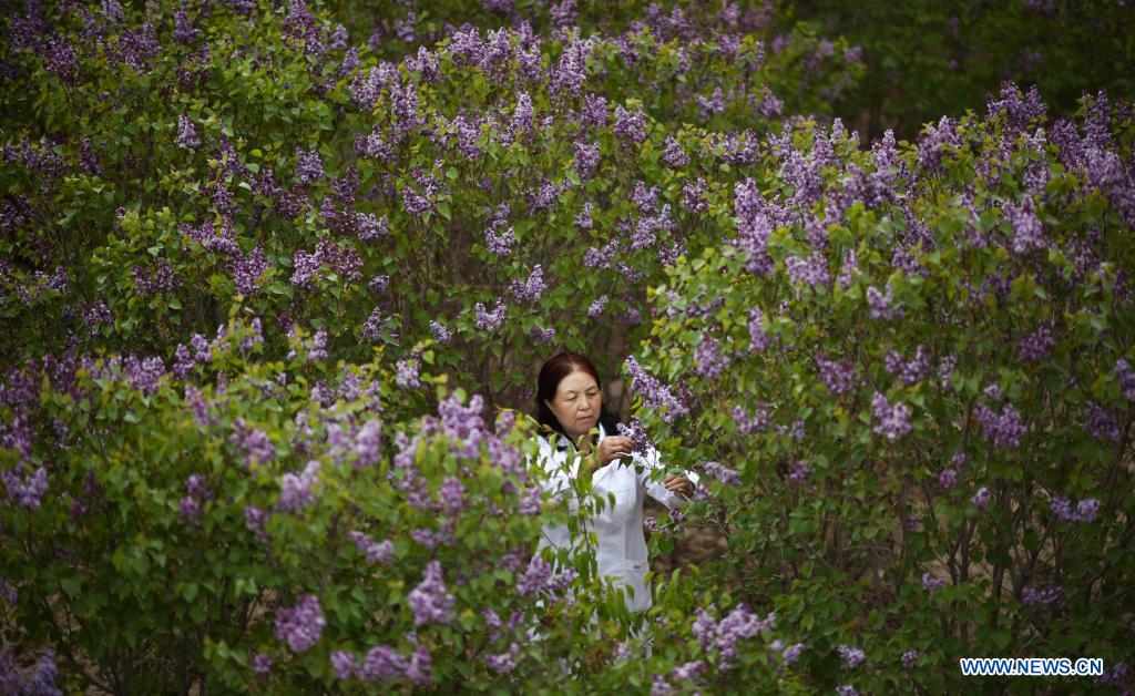 Zhang Jinmei checks the flowering of lilacs at a seedling breeding base of Xining forestry science research center in northwest China's Qinghai Province, May 6, 2021. (Xinhua/Wu Gang)