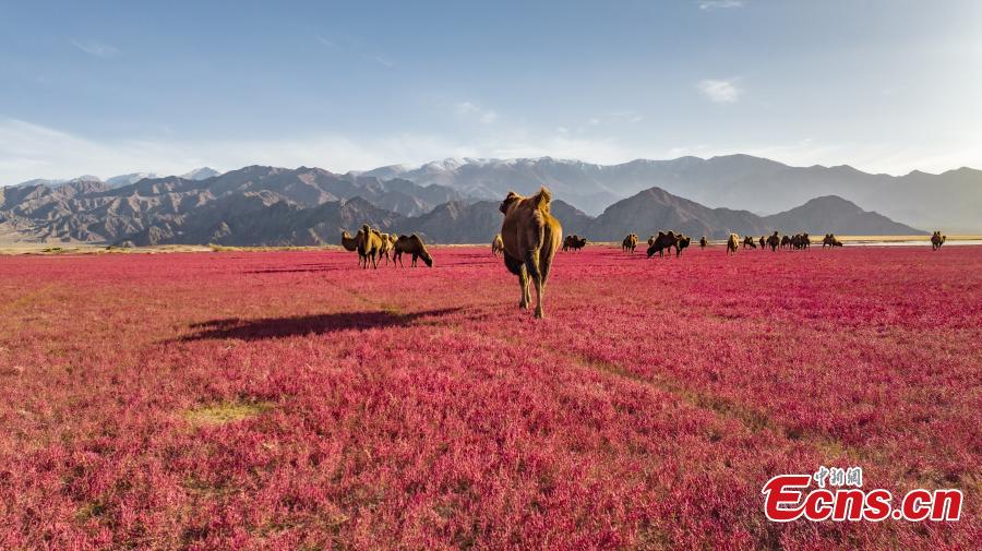 Camels forage at Dulan Lake National Wetland Park in Qaidam Basin, northwest China's Qinghai Province. A large field of forage grass grows on the wetland in the park, turning it scarlet. (Photo: China News Service/Ma Xiang)