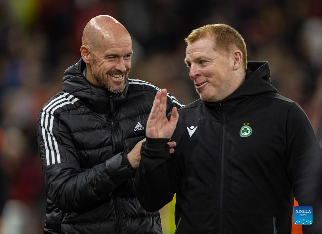 Manchester United's manager Erik ten Hag (L) and Omonia's head coach Neil Lennon react before the UEFA Europa League Group E match between Manchester United and Omonia FC in Manchester, Britain, on Oct. 13, 2022. (Xinhua)