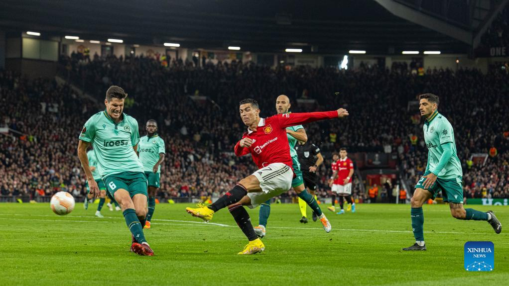 Manchester United's Cristiano Ronaldo (front C) shoots during the UEFA Europa League Group E match between Manchester United and Omonia FC in Manchester, Britain, on Oct. 13, 2022. (Xinhua)