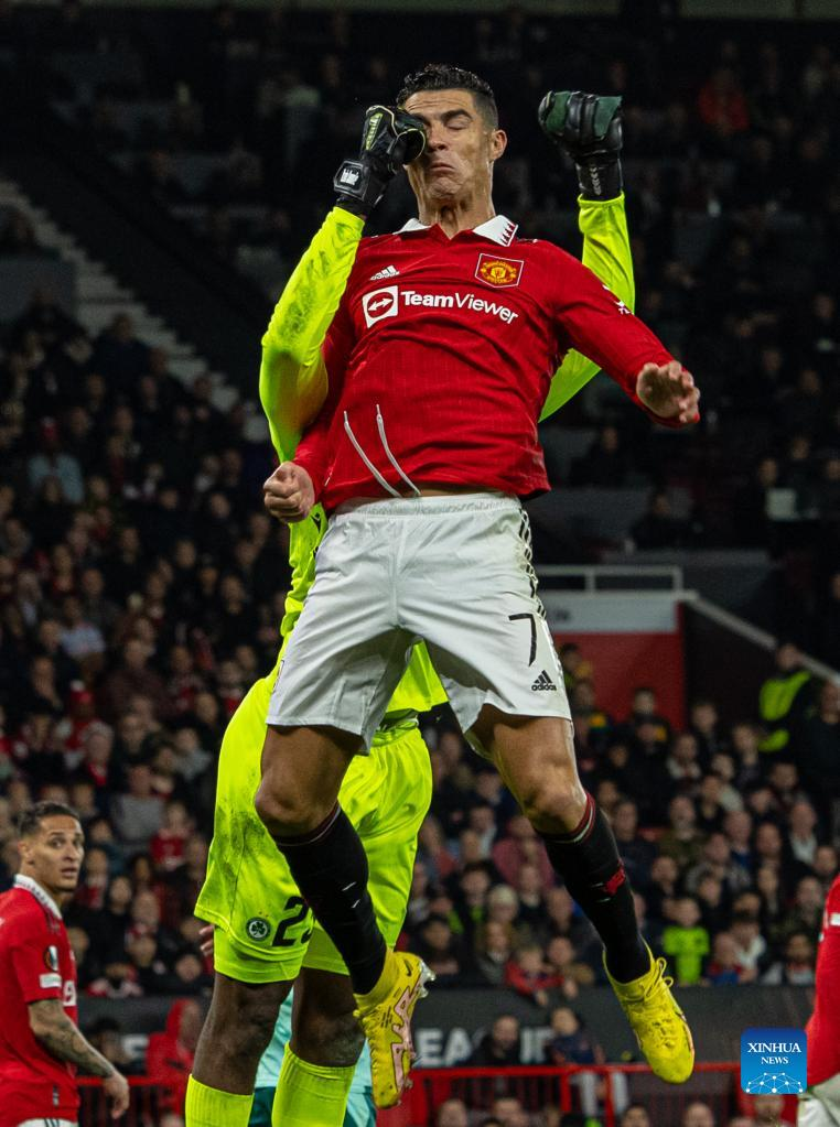Manchester United's Cristiano Ronaldo (front) is challenged by Omonia's goalkeeper Francis Uzoho during the UEFA Europa League Group E match between Manchester United and Omonia FC in Manchester, Britain, on Oct. 13, 2022. (Xinhua)