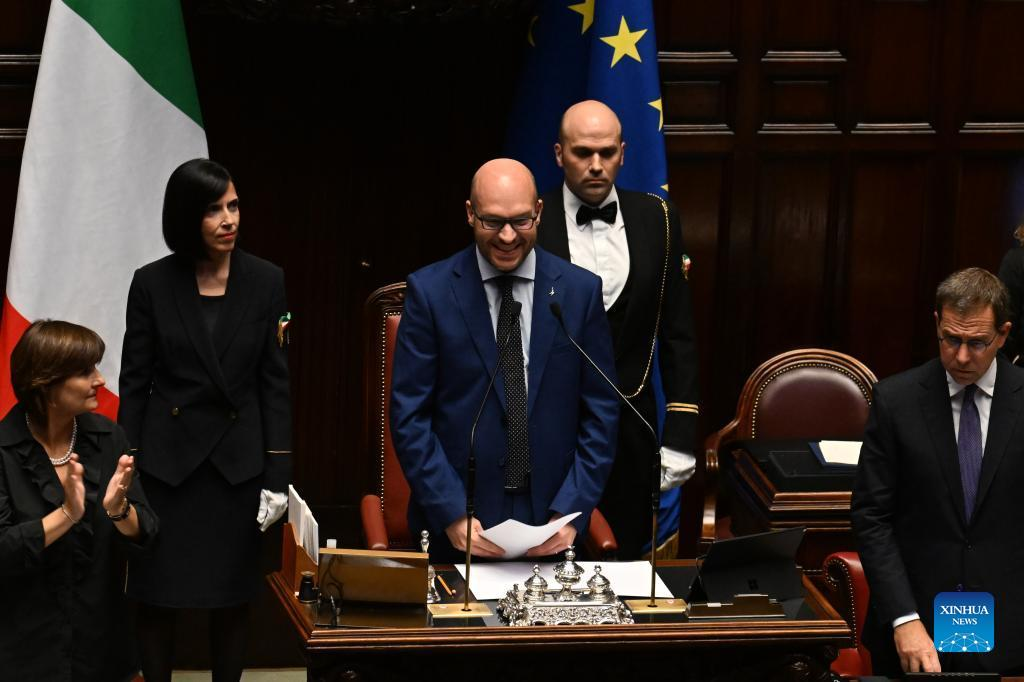 The newly elected speaker of the lower house of Italy's parliament Lorenzo Fontana (C) is seen at the lower house of Italy's parliament in Rome, Italy, on Oct. 14, 2022. Lorenzo Fontana, a two-time minister from a party likely to be a junior member of the next Italian government coalition, was selected on Friday as speaker of the lower house of Italy's parliament. Fontana's selection as speaker of the Chamber of Deputies followed the selection of Ignazio La Russa Thursday as president of the Senate, the upper house of parliament. (Photo by Alberto Lingria/Xinhua)