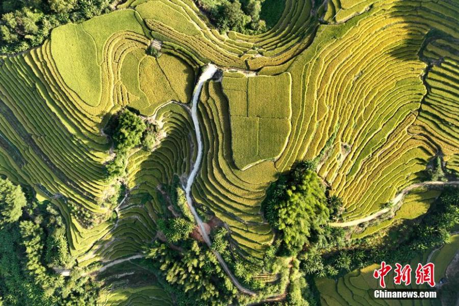 Aerial view shows picturesque scene of golden terraced fields in Shanghang County of Longyan City, east China's Fujian Province, Oct. 13, 2022. More than 1,500 hectares of paddy rice entered harvest. (Photo: China News Service/Zhang Jinchuan)