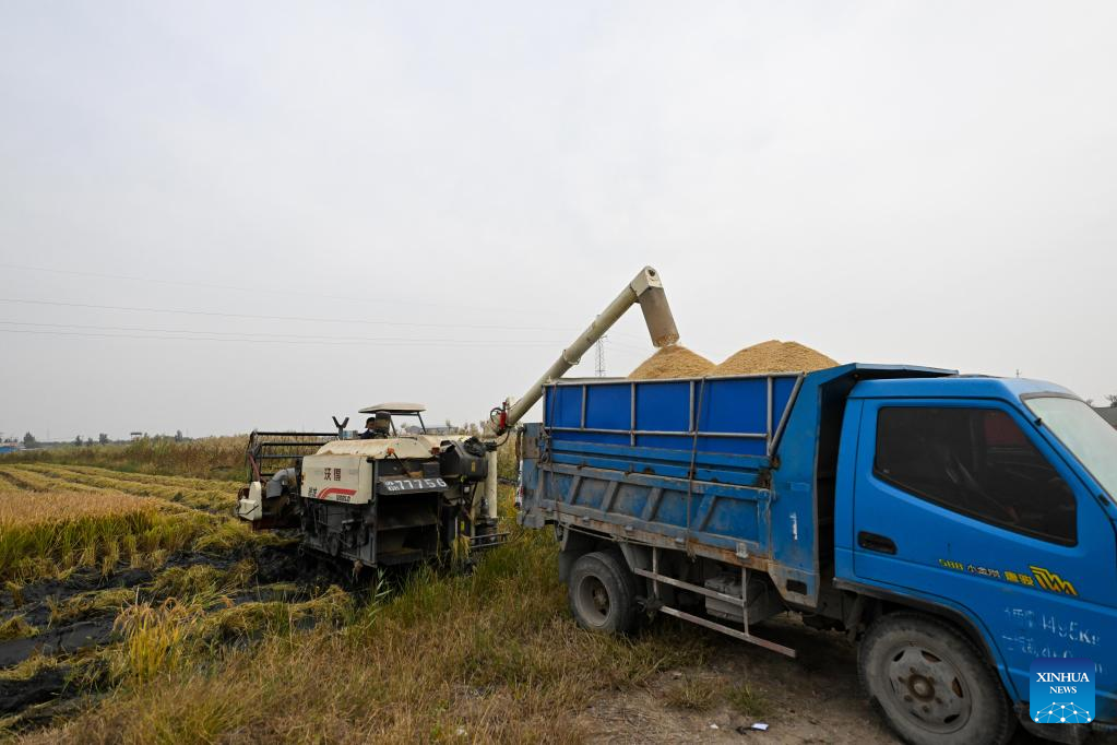 Newly-harvested rice is loaded onto a truck at Xiaozhan Town of Jinnan District, north China's Tianjin, Oct. 13, 2022. Xiaozhan rice, which is a popular rice variety in China, is originated in Xiaozhan Town of Tianjin. Lately Xiaozhan rice has entered its harvest season. (Xinhua/Sun Fanyue)